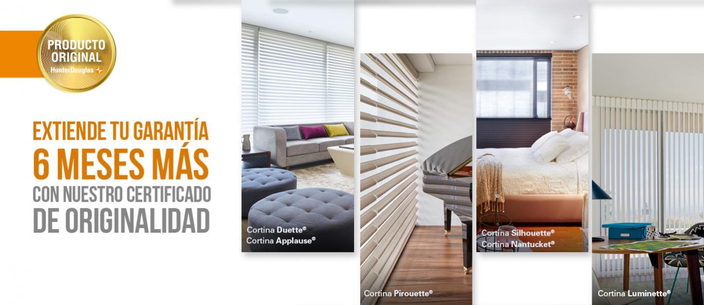 Todas las Cortinas y Persianas HunterDouglas® están amparadas por la garantía legal, productos como las Cortinas Blackout Duette y las Cortinas Silhouette son cubiertas por garantía de hasta 6 años, una vez que ésta ha vencido, ofrecemos una extensión de 6 meses desde la fecha exacta de compra.
